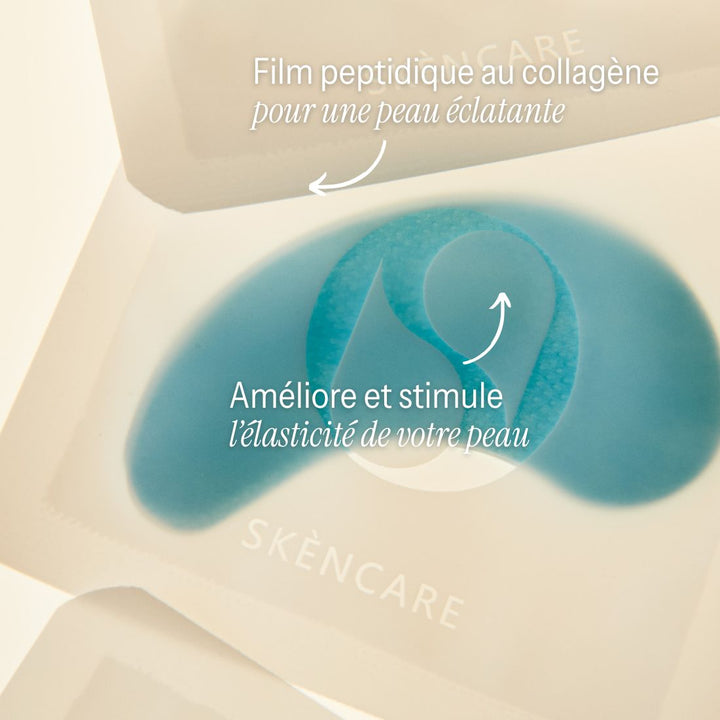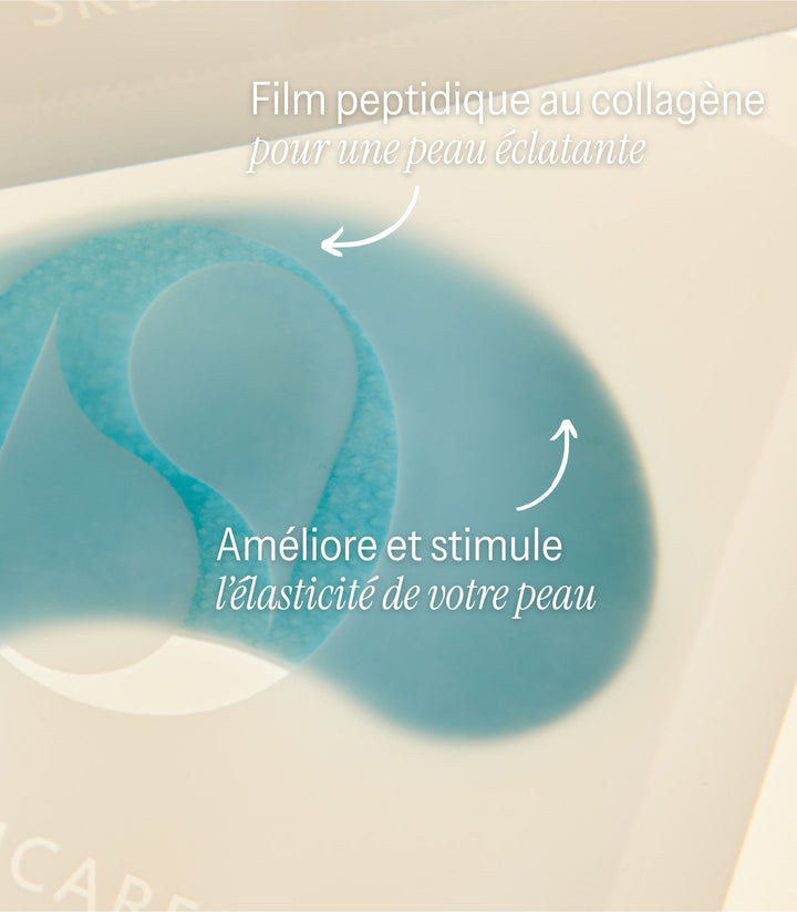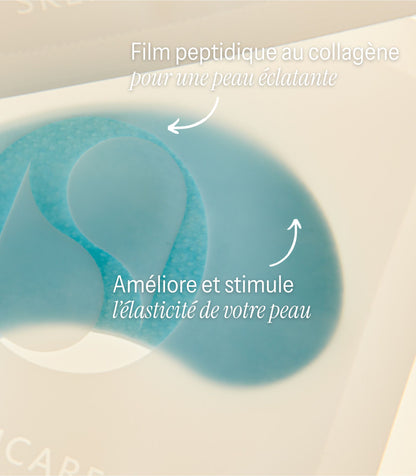 Le masque pour les yeux contient du collagène hydrolysé et de l'acide hyaluronique. Ces ingrédients pénètrent profondément dans la peau et renforcent sa structure de soutien, atténuant ainsi visiblement les ridules et rendant la peau immédiatement plus rebondie. La glycérine renforce cet effet hydratant en maintenant le niveau d'hydratation. Le masque pour les yeux forme un film respirant mais occlusif qui « emprisonne » les principes actifs dans la peau et la protège durablement contre la perte d'hydratation. L'extrait de propolis apaise les rougeurs et apporte de puissants antioxydants, atténuant ainsi les poches et les signes de fatigue. La soie hydrolysée et la fibroïne adoucissent la peau et lui confèrent un fini soyeux.