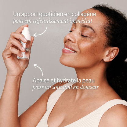 The Mist est une brume rafraîchissante pour le visage qui hydrate et raffermit immédiatement la peau tout en lui donnant un éclat sain grâce à un mélange d'acide hyaluronique, de collagène hydrolysé et d'ingrédients hydratants.