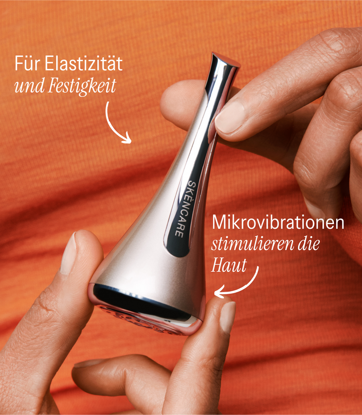 The Wand erzeugt schnelle Mikrovibrationen. Diese Vibrationen garantieren verschiedene spürbare Vorteile: Sie regen die Hautdurchblutung an, tragen zu einer verbesserten Hautelastizität bei und sorgen dafür, dass Cremes und Seren besser einziehen.